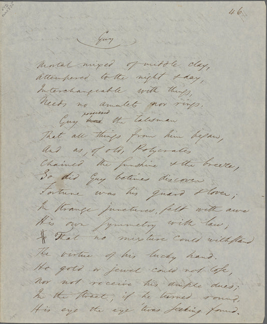 "The bard has reached the middle state..." MS poem, "Verses read to the Saturday Club on James Russell Lowell's fiftieth Birthday," in the hand of E. W. Emerson