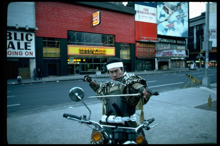 A castmember from the Broadway production of the musical "Pacific Overtures" posing in the middle of Times Square to advertise the show. (New York)