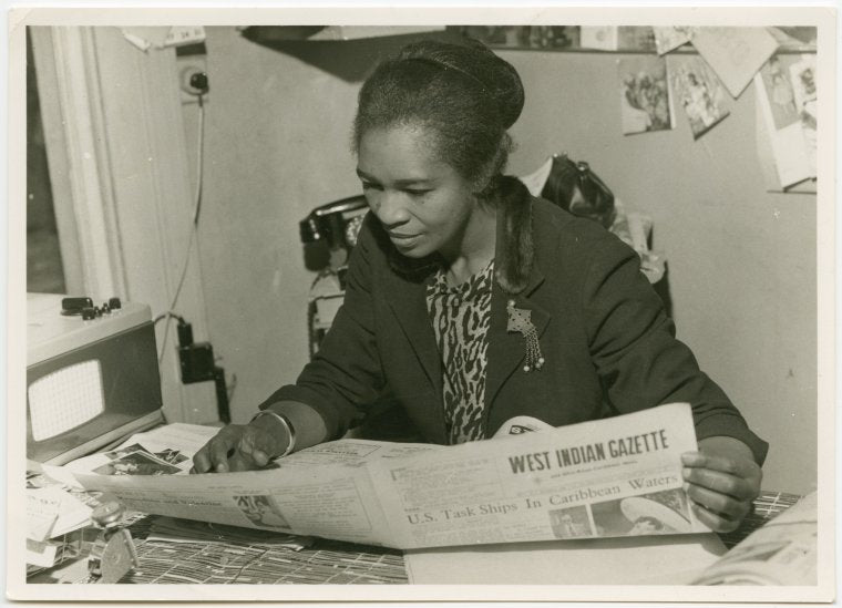 Claudia Jones reading the West Indian Gazette, London, 1960s