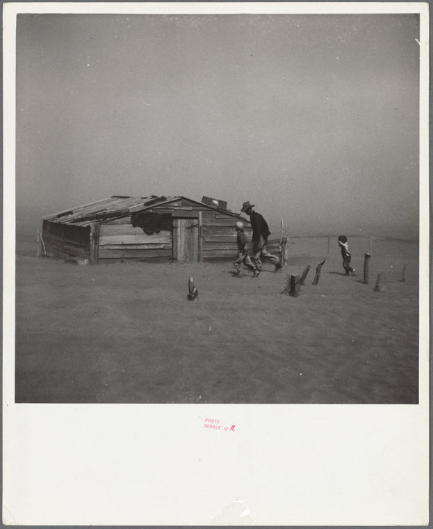 Farmer and sons walking in the face of a dust storm. Cimarron County, Oklahoma