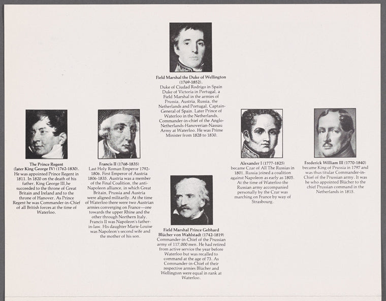 Field Marshal the Duke of Wellington (1769-1852). The Prince Regent (later King George IV) (1762-1830). Francis II (1768-1835). Field Marshal Prince Gebhard Blücher von Wahlstadt (1742-1819). Alexander I (1777-1825). Frederick William III (1770-1840)