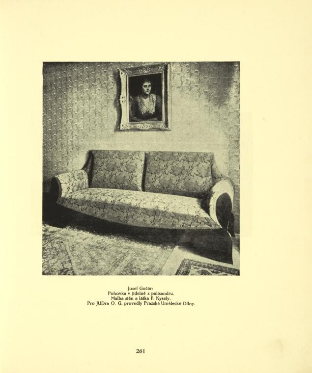 Josef Gočár: Pohovka v jídelně z palisandru. Malba stěn a látka F. Kysely. Pro JUDra O.G. provedly Pražské Umělecke Dílny.