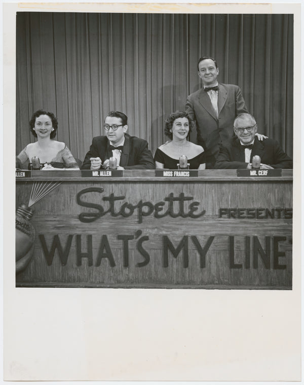 Participants of television program What's My Line (l. to r.), including Dorothy Kilgallen, Steve Allen, Arlene Francis, John Daly (host), and Bennett Cerf